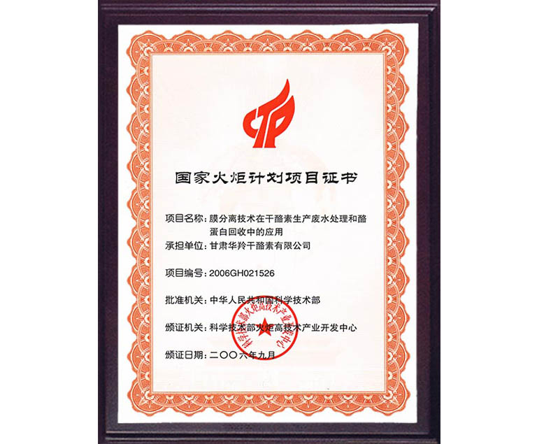 國家火炬計劃項目證書