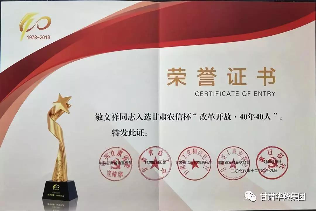 2018年12月29日,甘肅省改革開放•40年40人表彰儀式在甘肅省大劇院隆重舉行,甘肅華羚實(shí)業(yè)集團(tuán)董事長(zhǎng)敏文祥等40人受到表彰,被授予“改革開放•40年40人”榮譽(yù)稱號(hào)。甘肅華羚實(shí)業(yè)集團(tuán)董事長(zhǎng)是甘南州唯一獲此殊榮者。