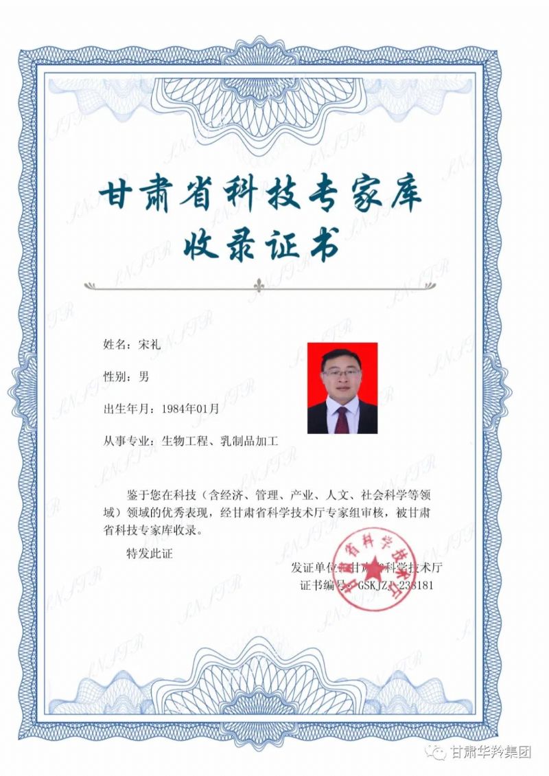 近日,甘肅華羚乳品股份有限公司技術(shù)中心副高級工程師、經(jīng)理、甘南牦牛乳研究院專家宋禮同志經(jīng)甘肅省科學(xué)技術(shù)廳專家組審核,被甘肅省科技專家?guī)焓珍洝?/span>