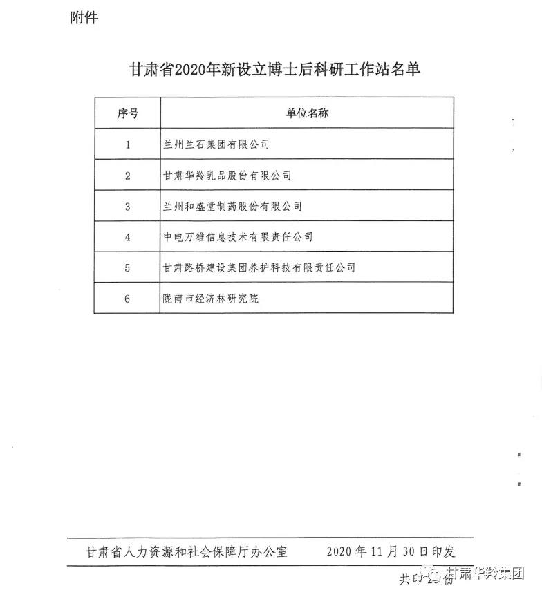 2020年11月30日,經人力資源和社會保障部、全國博士后管理委員會批準,甘肅華羚乳品股份有限公司獲準設立國家級博士后科研工作站。